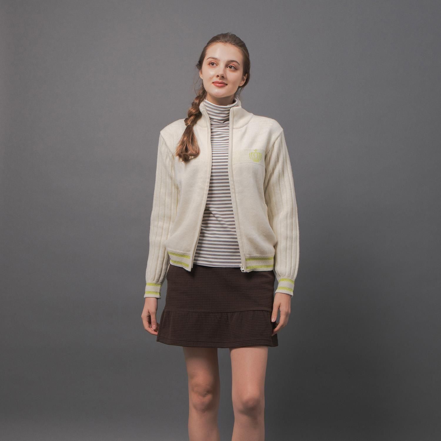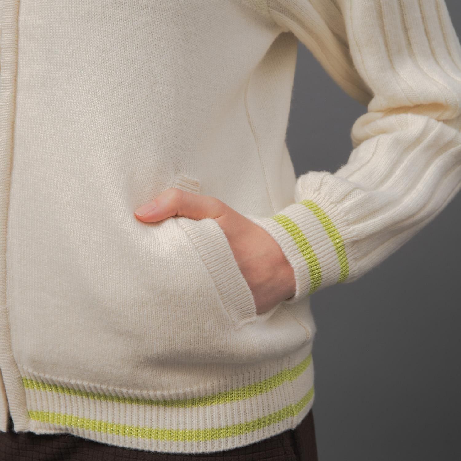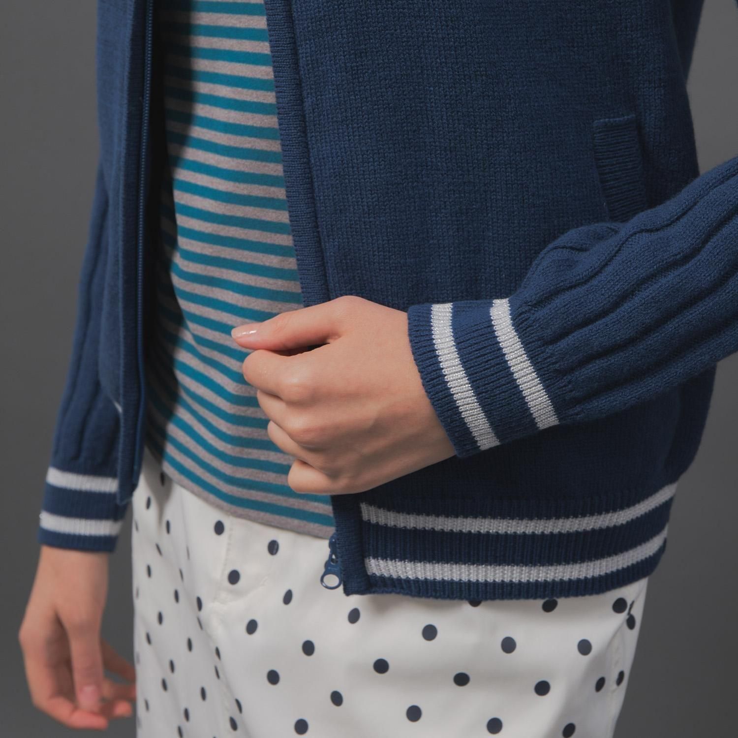 袖はリブ編みに、配色部分には繊細なラメ糸を織り交ぜることで、シンプルな中にさりげないエッジを効かせ、洗練されたデザインに仕上げました。ホワイト×イエローラメの明るく垢抜けた配色、ブルー×シルバーの上品で華やかな配色、どちらもスタイリングに彩りを添えます。
