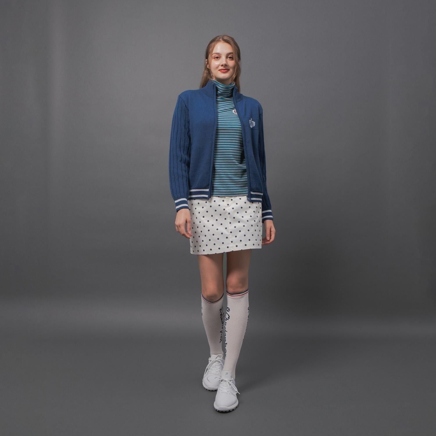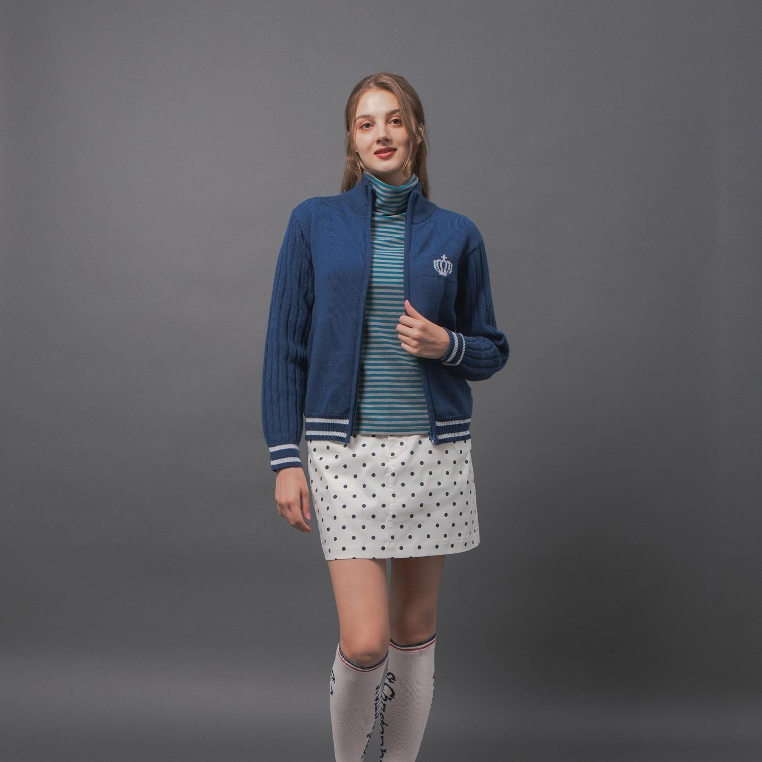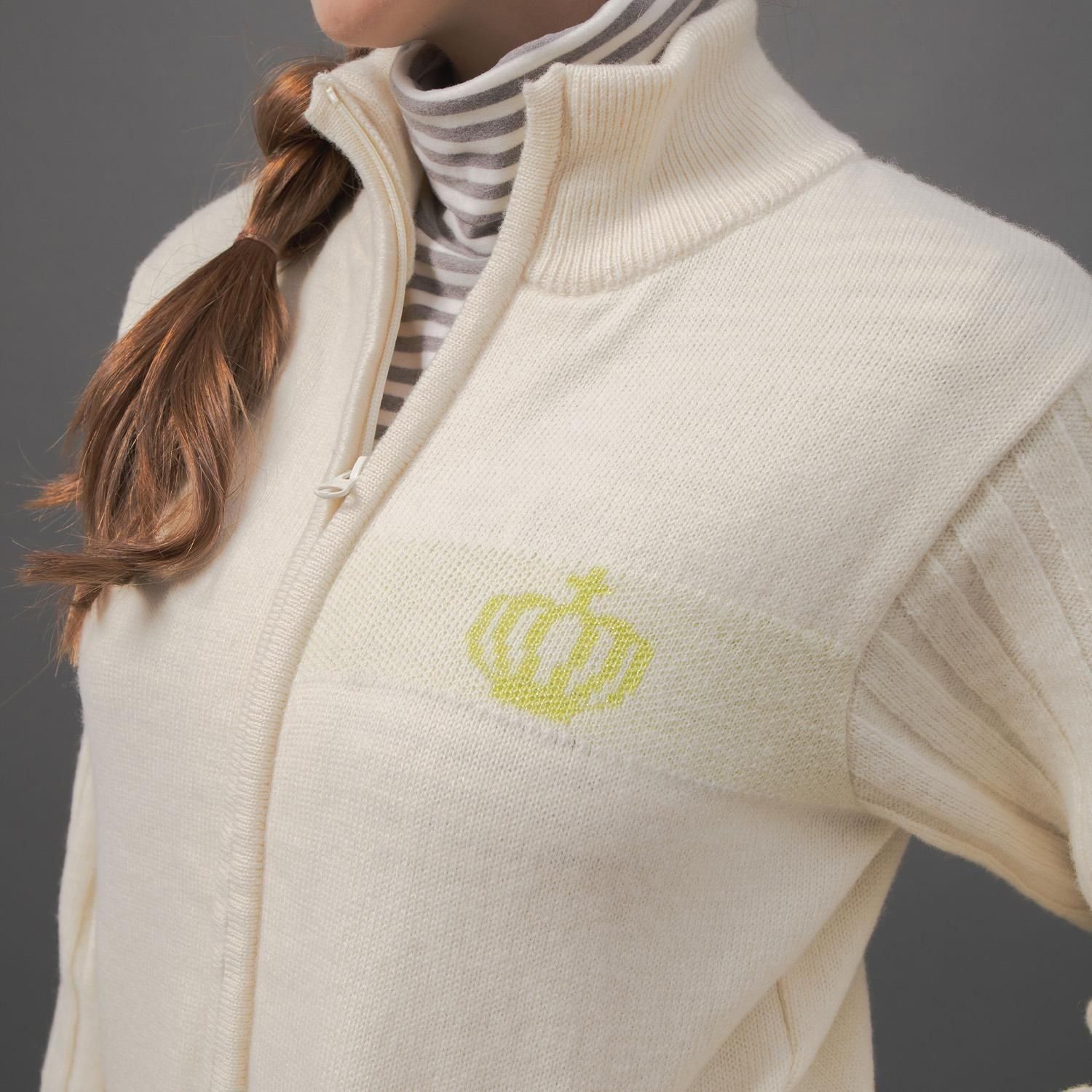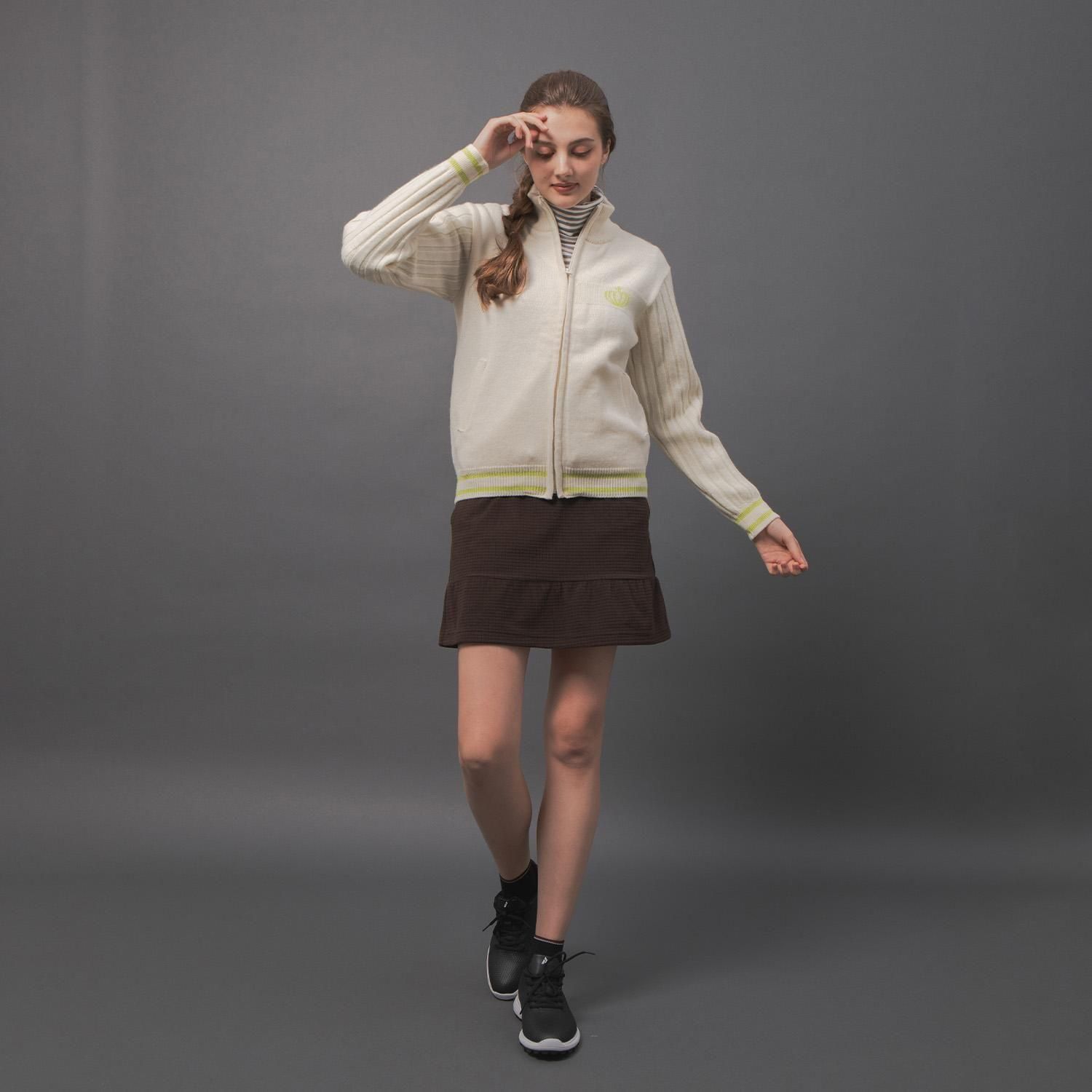 袖はリブ編みに、配色部分には繊細なラメ糸を織り交ぜることで、シンプルな中にさりげないエッジを効かせ、洗練されたデザインに仕上げました。ホワイト×イエローラメの明るく垢抜けた配色、ブルー×シルバーの上品で華やかな配色、どちらもスタイリングに彩りを添えます。