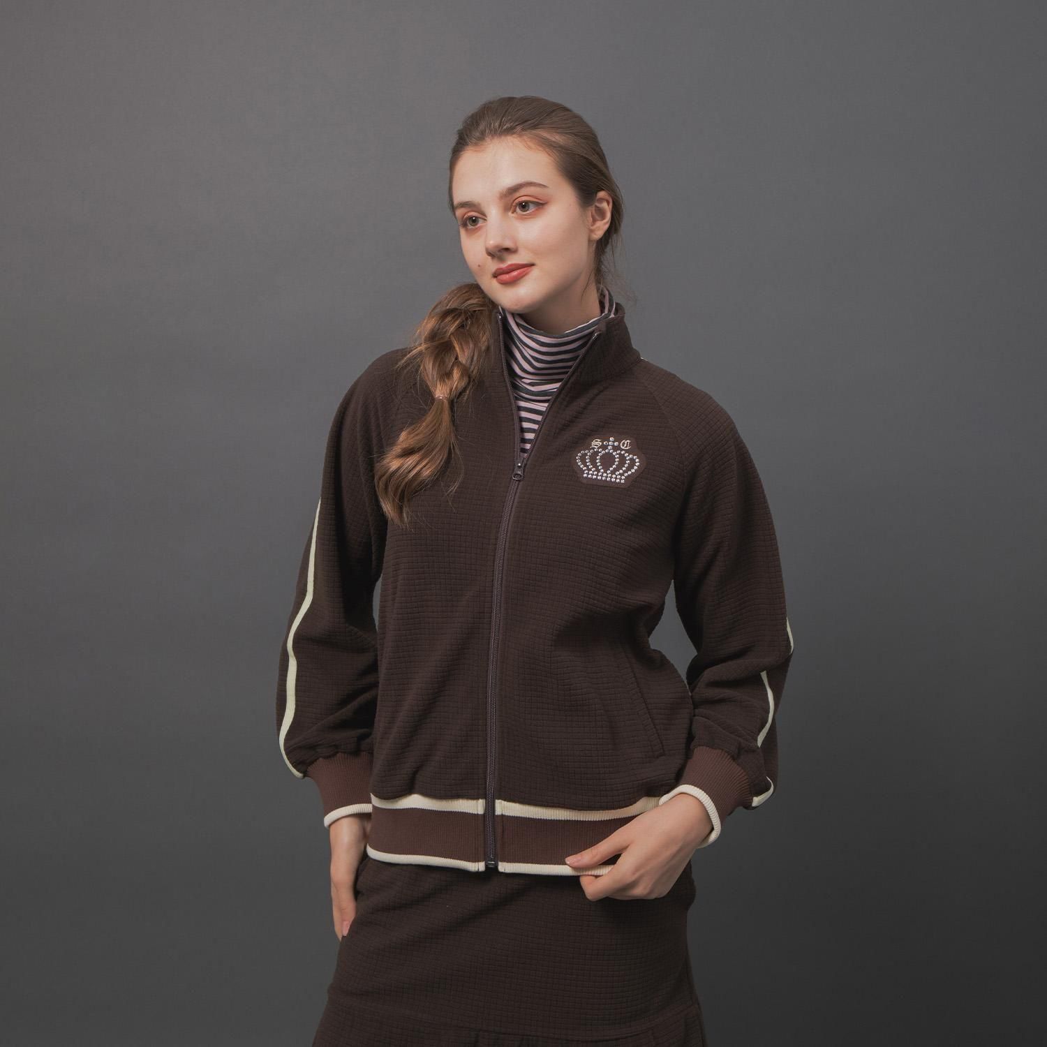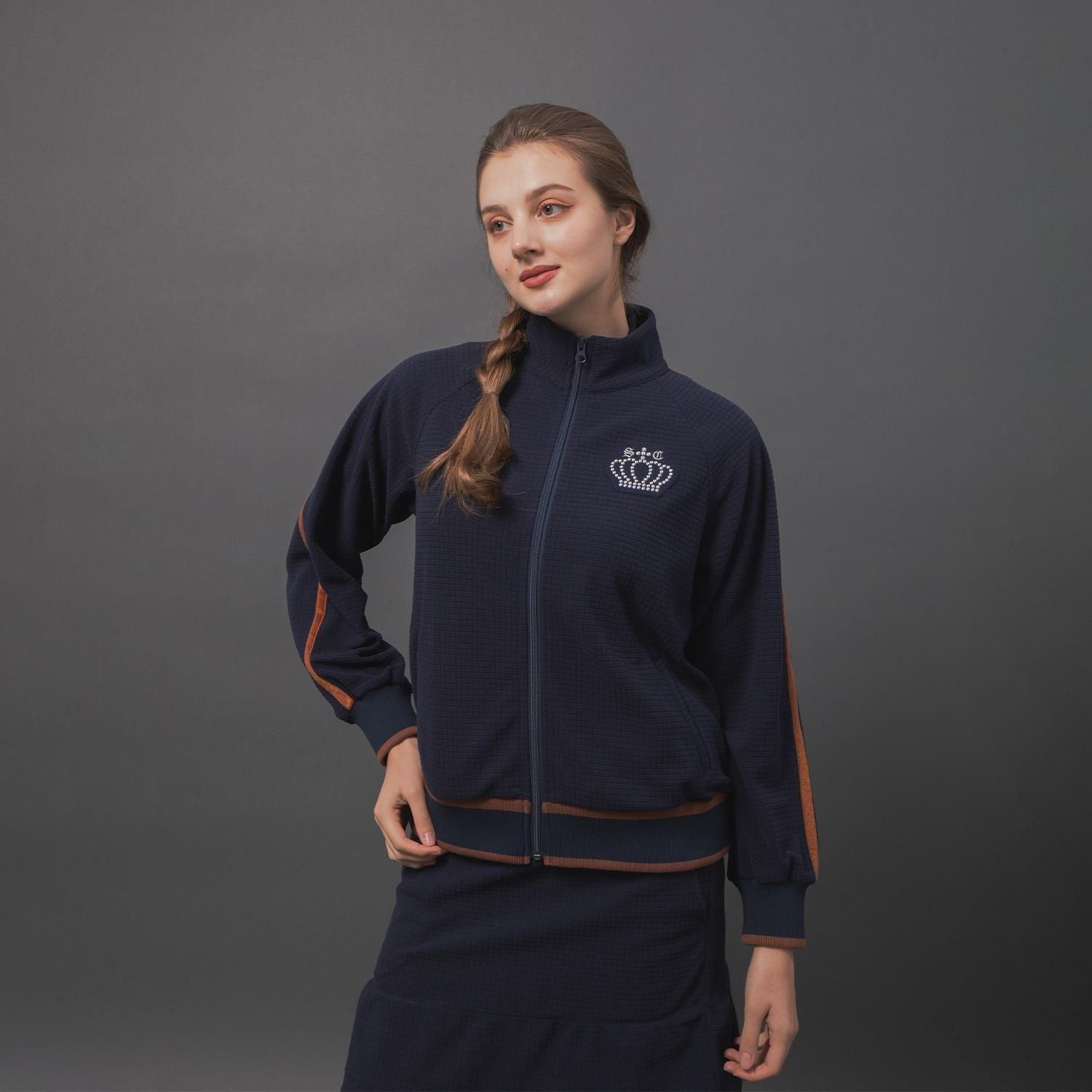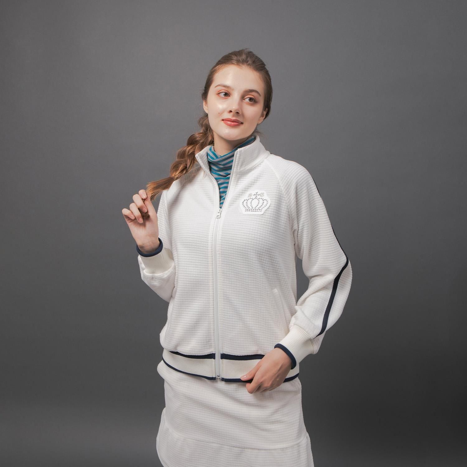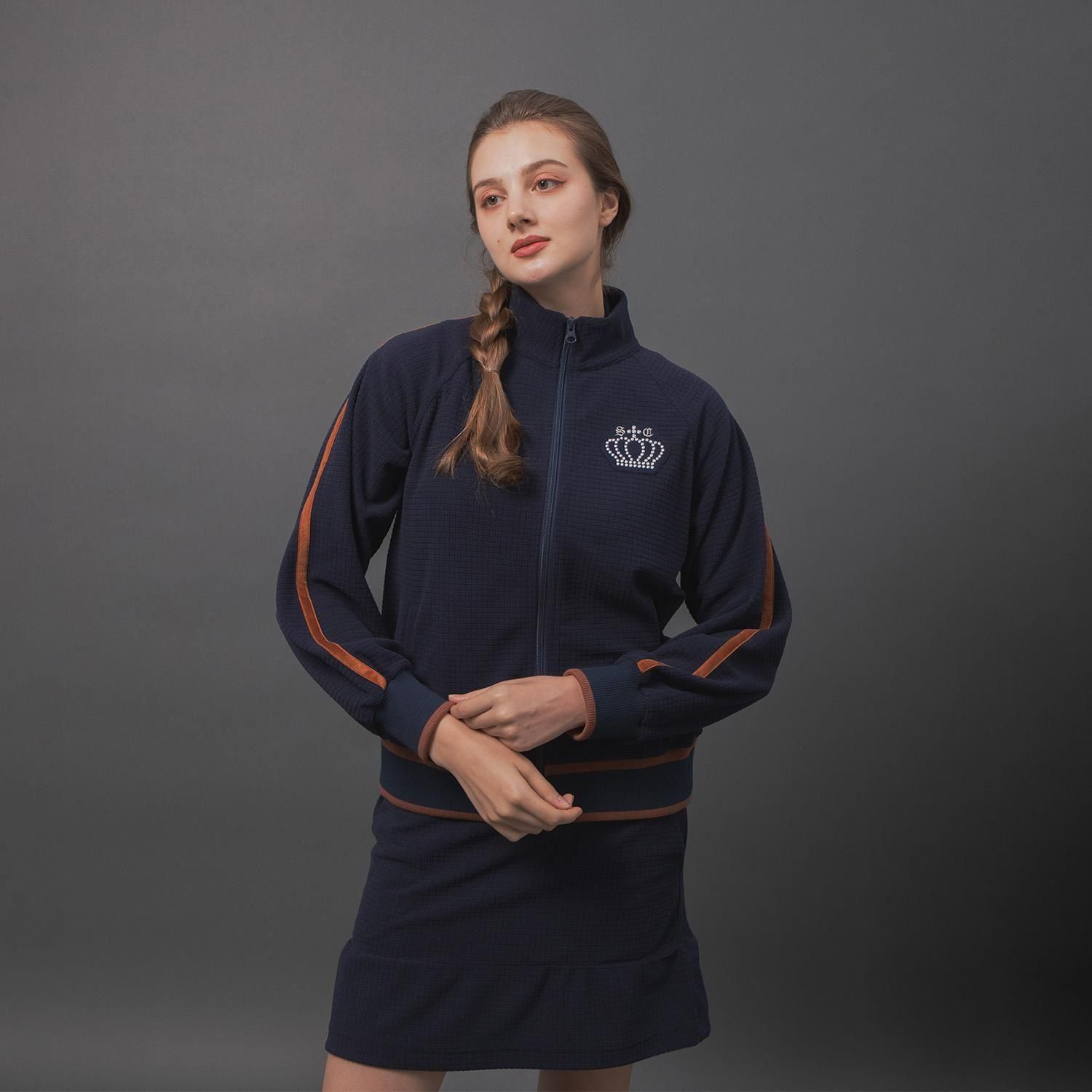 袖にはベルベット素材の配色テープをあしらい、モコモコとした見た目が秋冬らしいワンポイントに。さらに、袖口と裾のリブには深みのあるカラーを加え、全体を華やかに引き締めました。ホワイトには上品なネイビー、ブラウンには洗練されたイエロー、ネイビーには秋らしいブラウンを合わせ、カラーリングにもこだわりを。そして、胸元には存在感のある特大キラキラ王冠を添え、一枚で主役級の華やかさを演出します。