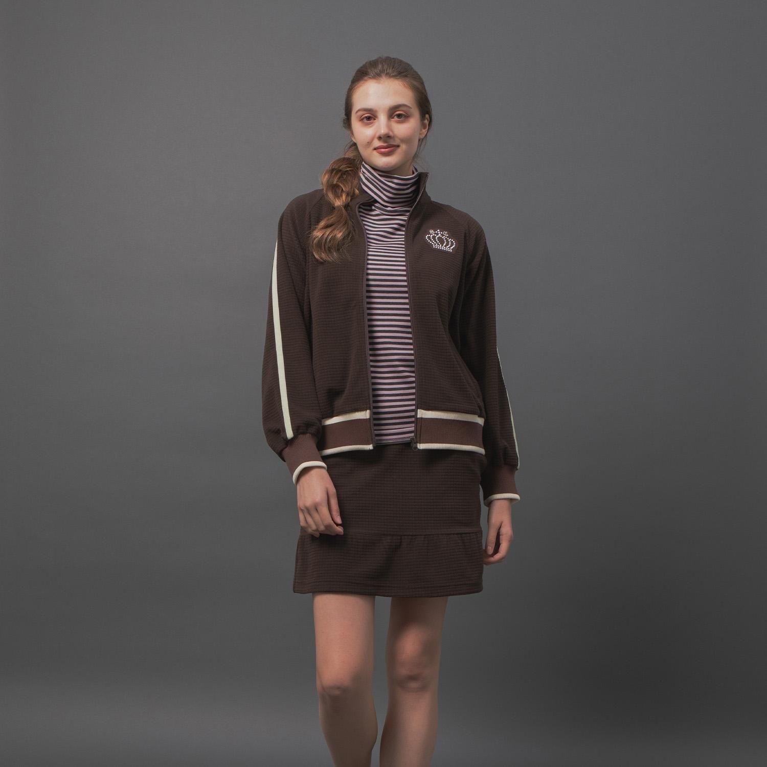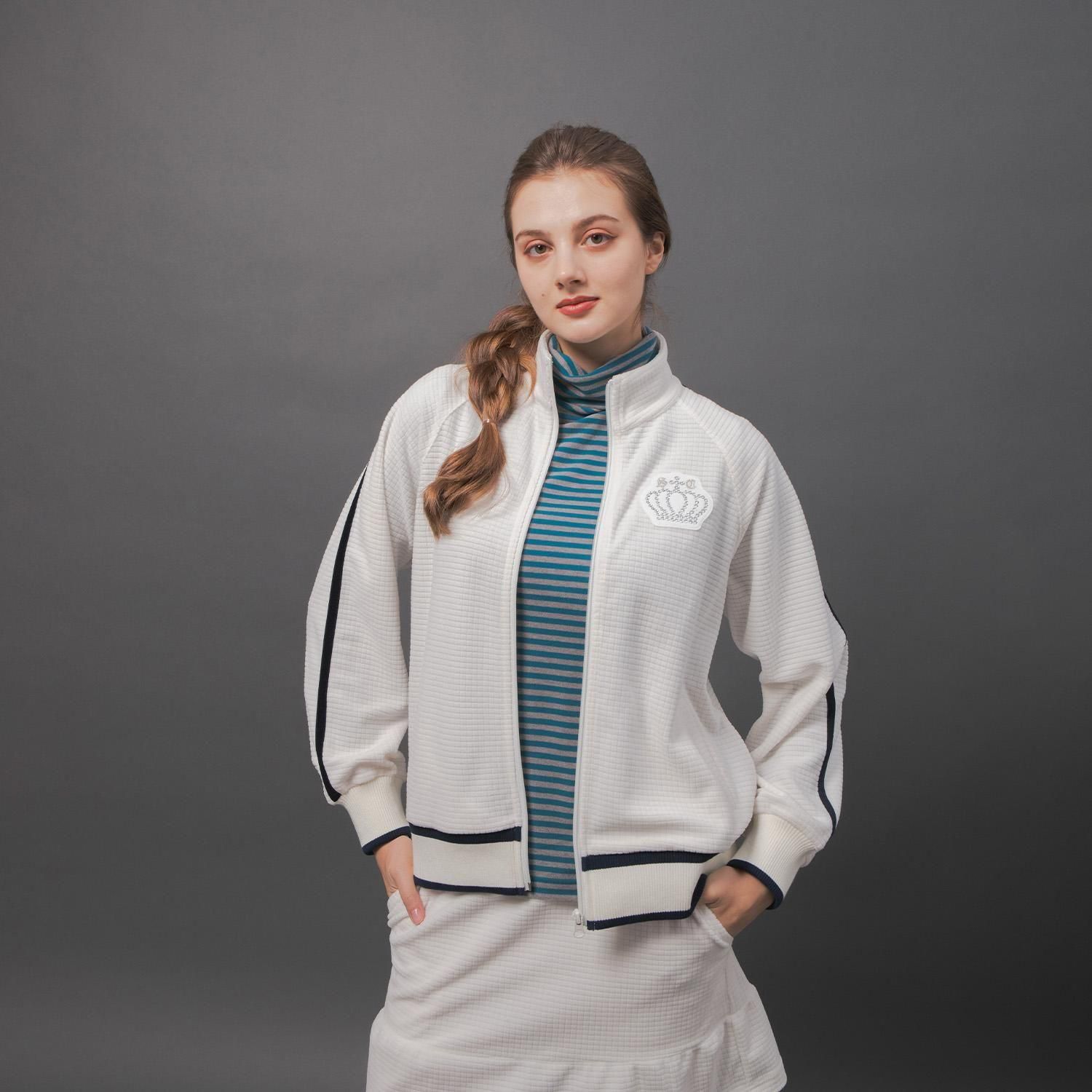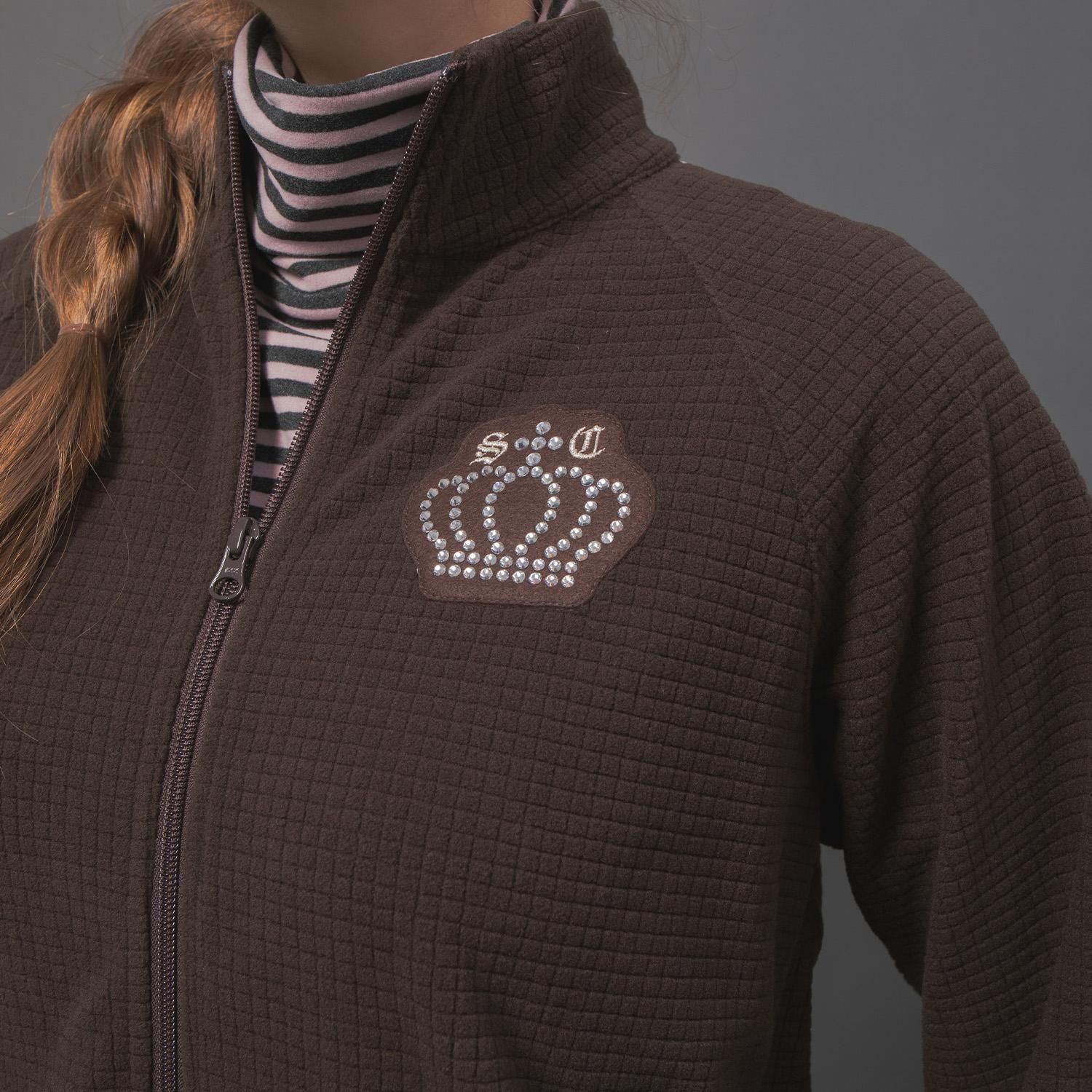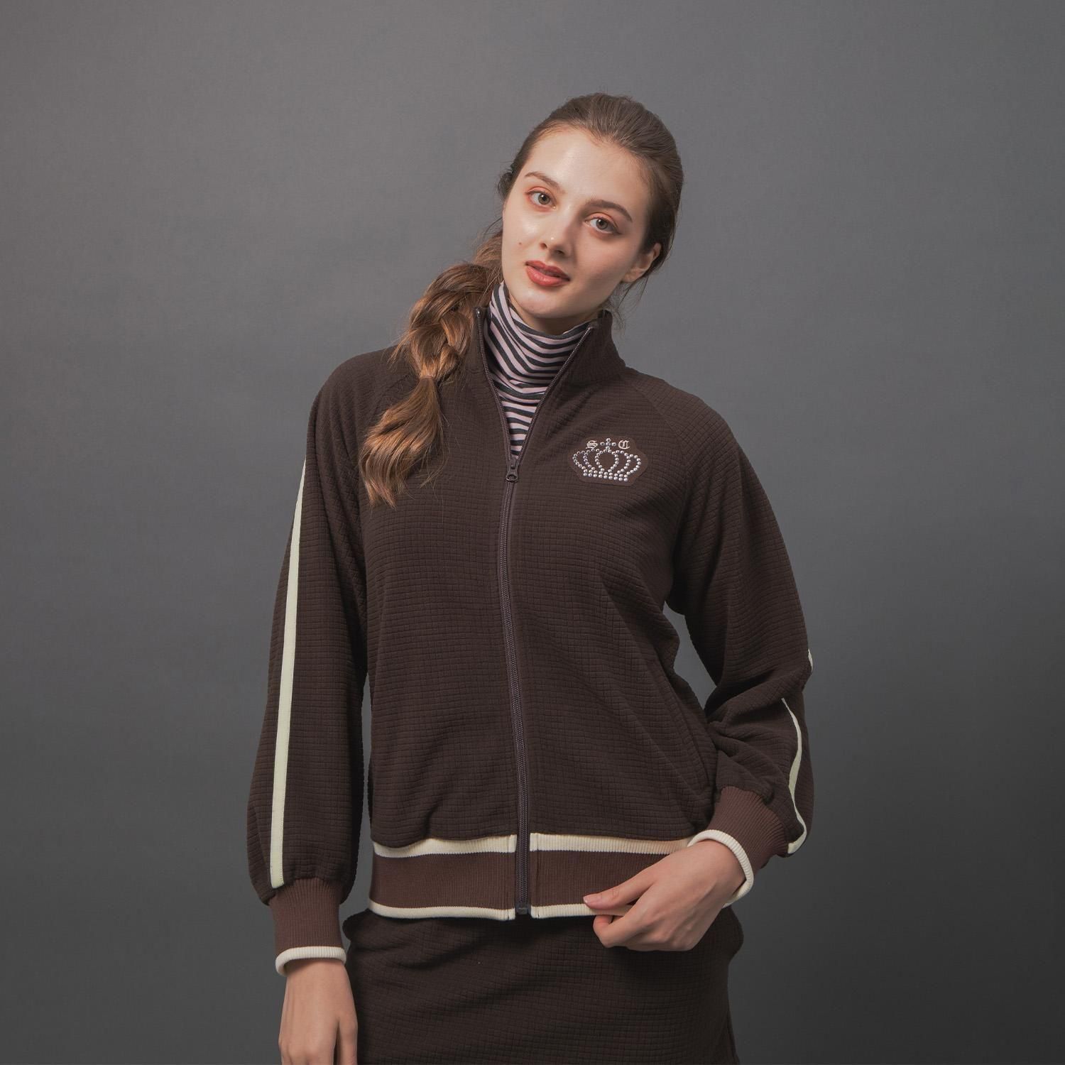 袖にはベルベット素材の配色テープをあしらい、モコモコとした見た目が秋冬らしいワンポイントに。さらに、袖口と裾のリブには深みのあるカラーを加え、全体を華やかに引き締めました。ホワイトには上品なネイビー、ブラウンには洗練されたイエロー、ネイビーには秋らしいブラウンを合わせ、カラーリングにもこだわりを。そして、胸元には存在感のある特大キラキラ王冠を添え、一枚で主役級の華やかさを演出します。