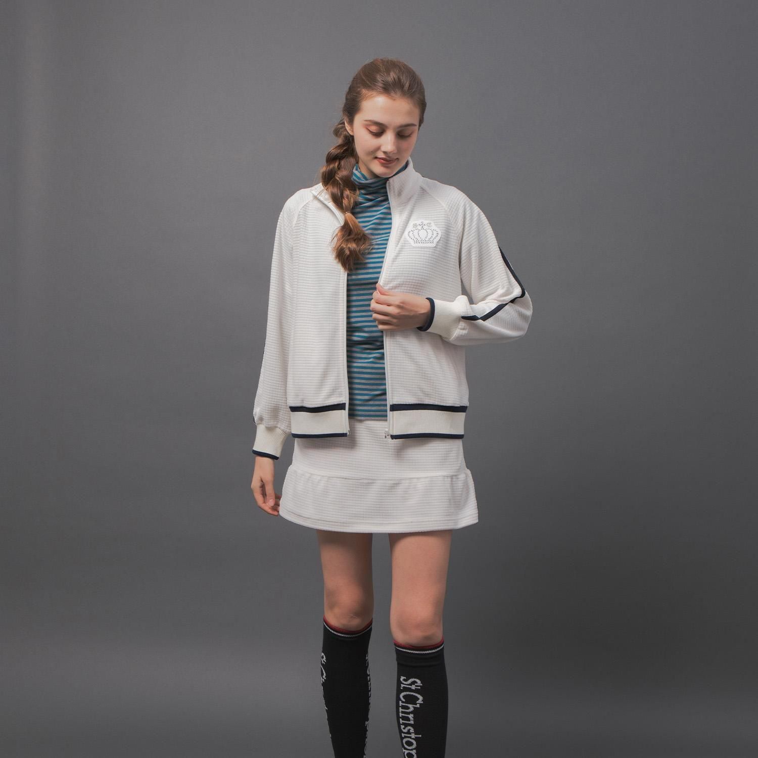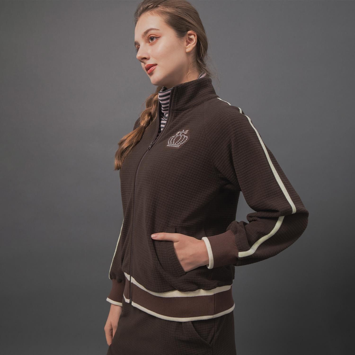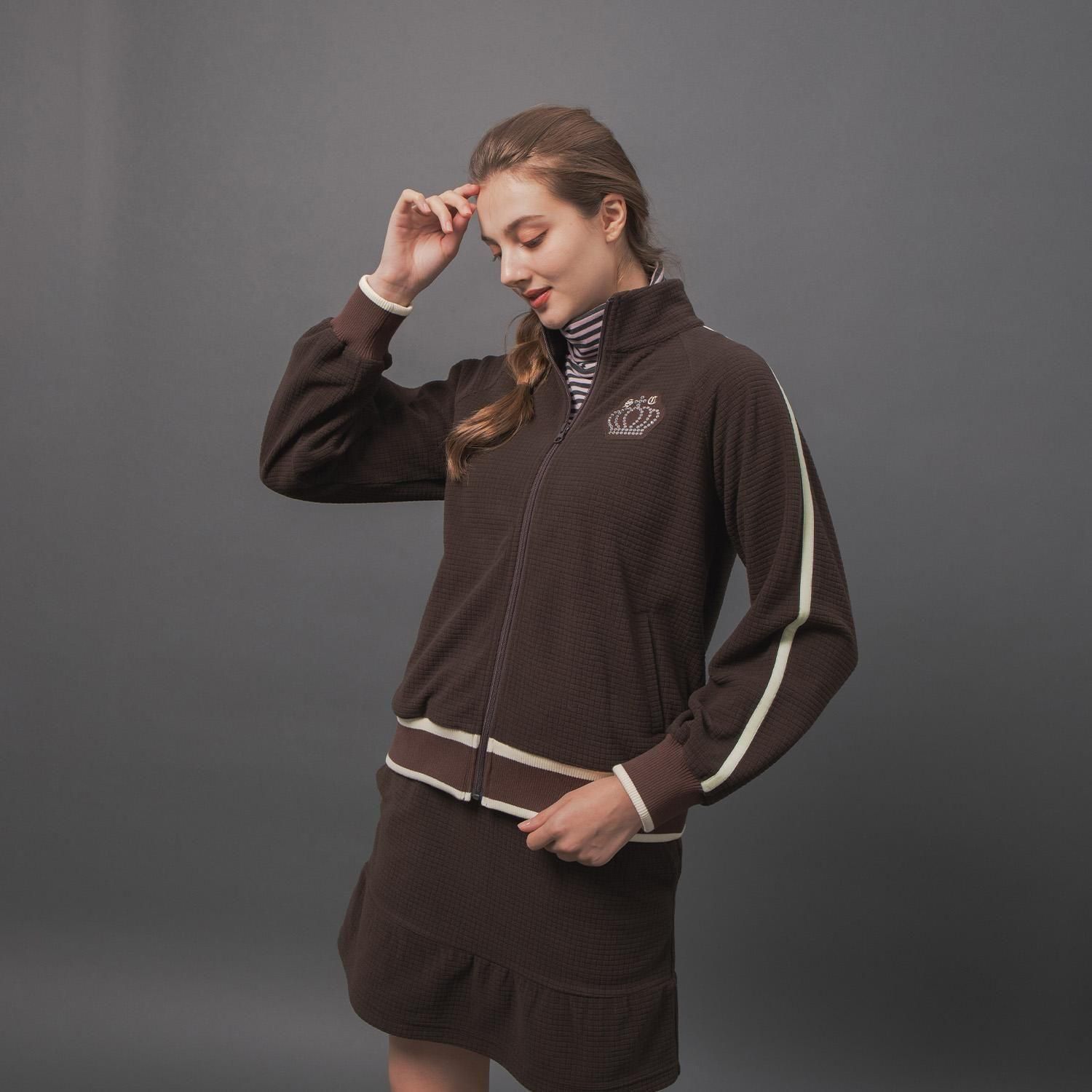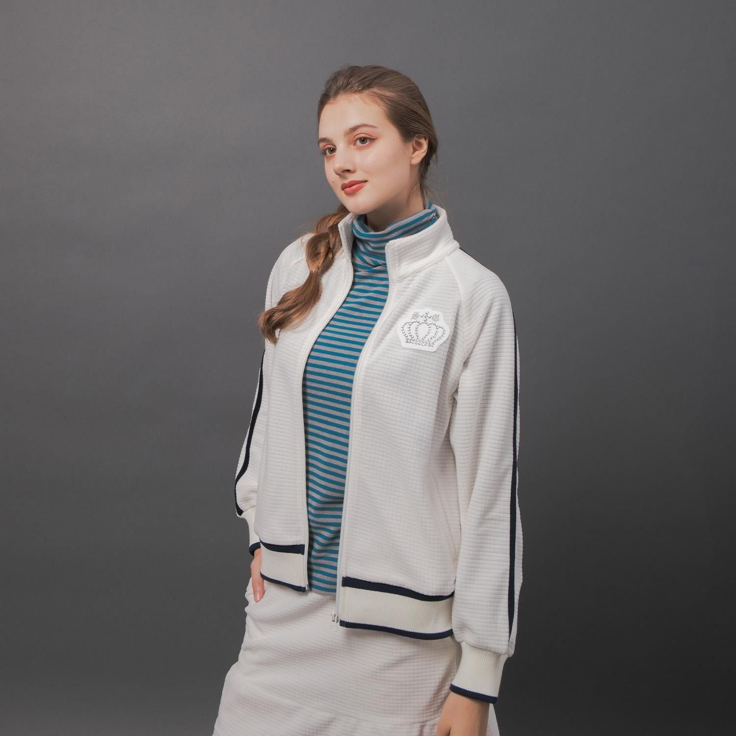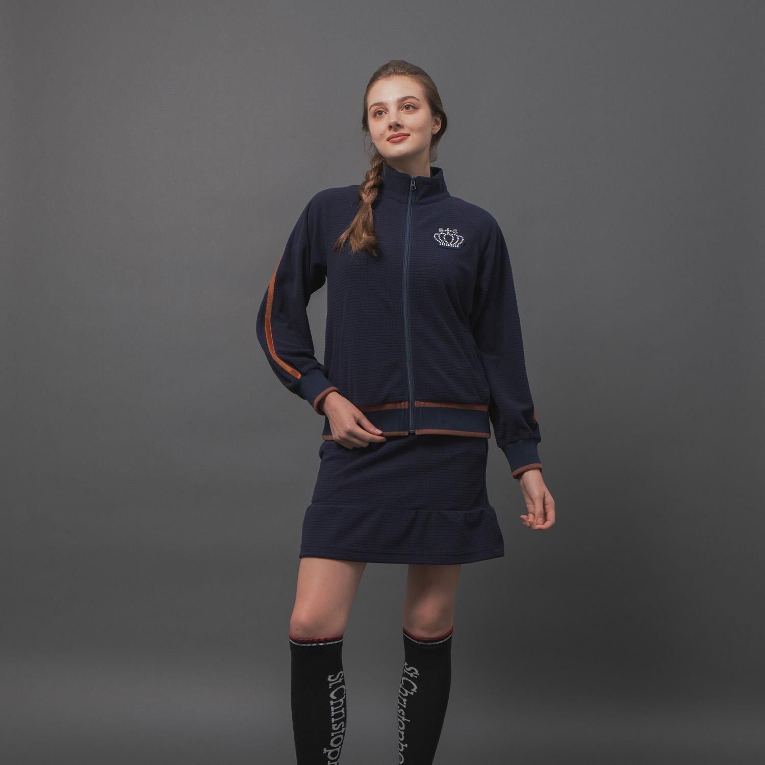 袖にはベルベット素材の配色テープをあしらい、モコモコとした見た目が秋冬らしいワンポイントに。さらに、袖口と裾のリブには深みのあるカラーを加え、全体を華やかに引き締めました。ホワイトには上品なネイビー、ブラウンには洗練されたイエロー、ネイビーには秋らしいブラウンを合わせ、カラーリングにもこだわりを。そして、胸元には存在感のある特大キラキラ王冠を添え、一枚で主役級の華やかさを演出します。