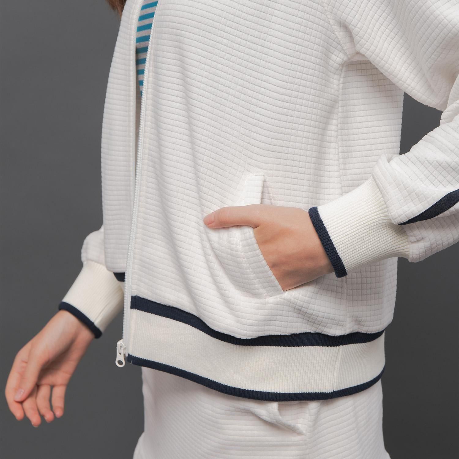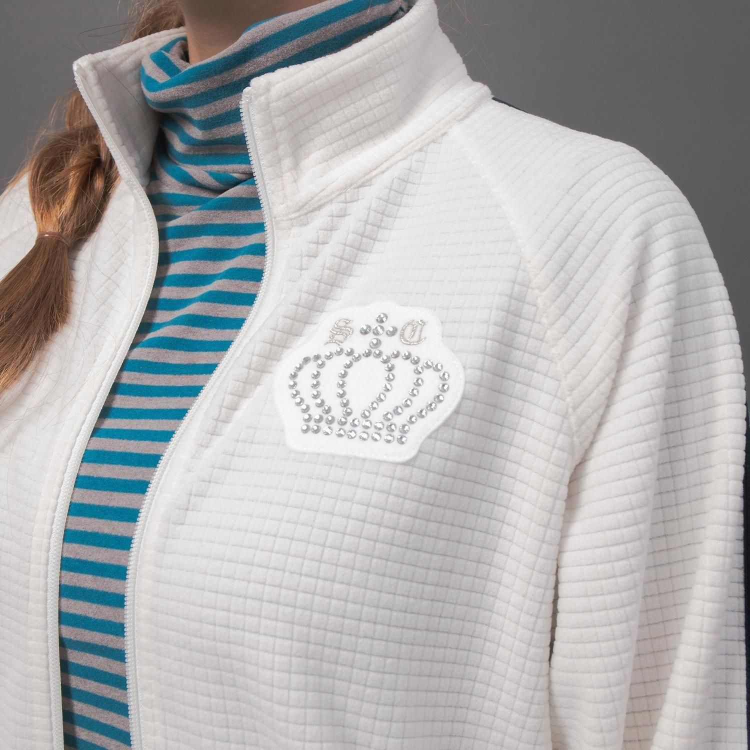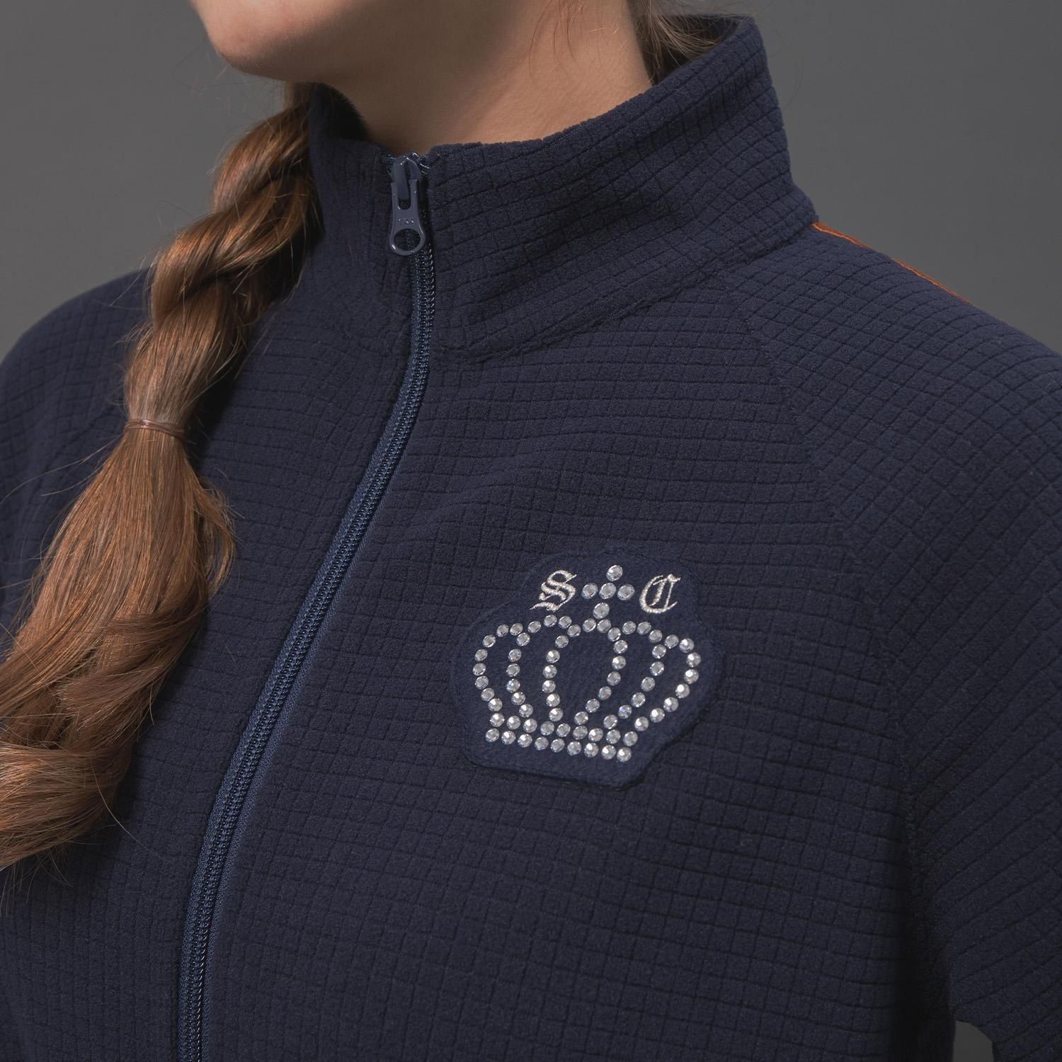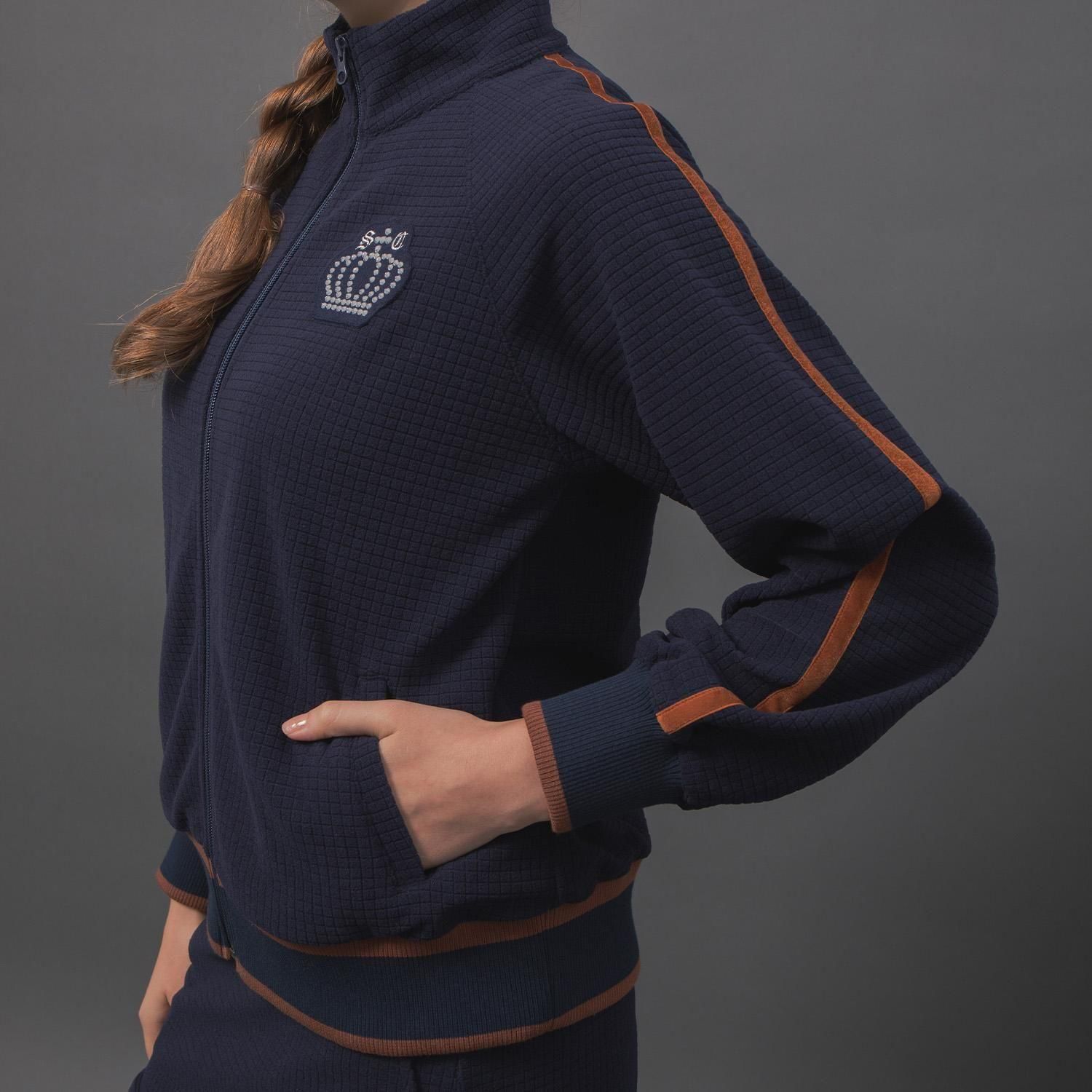 袖にはベルベット素材の配色テープをあしらい、モコモコとした見た目が秋冬らしいワンポイントに。さらに、袖口と裾のリブには深みのあるカラーを加え、全体を華やかに引き締めました。ホワイトには上品なネイビー、ブラウンには洗練されたイエロー、ネイビーには秋らしいブラウンを合わせ、カラーリングにもこだわりを。そして、胸元には存在感のある特大キラキラ王冠を添え、一枚で主役級の華やかさを演出します。